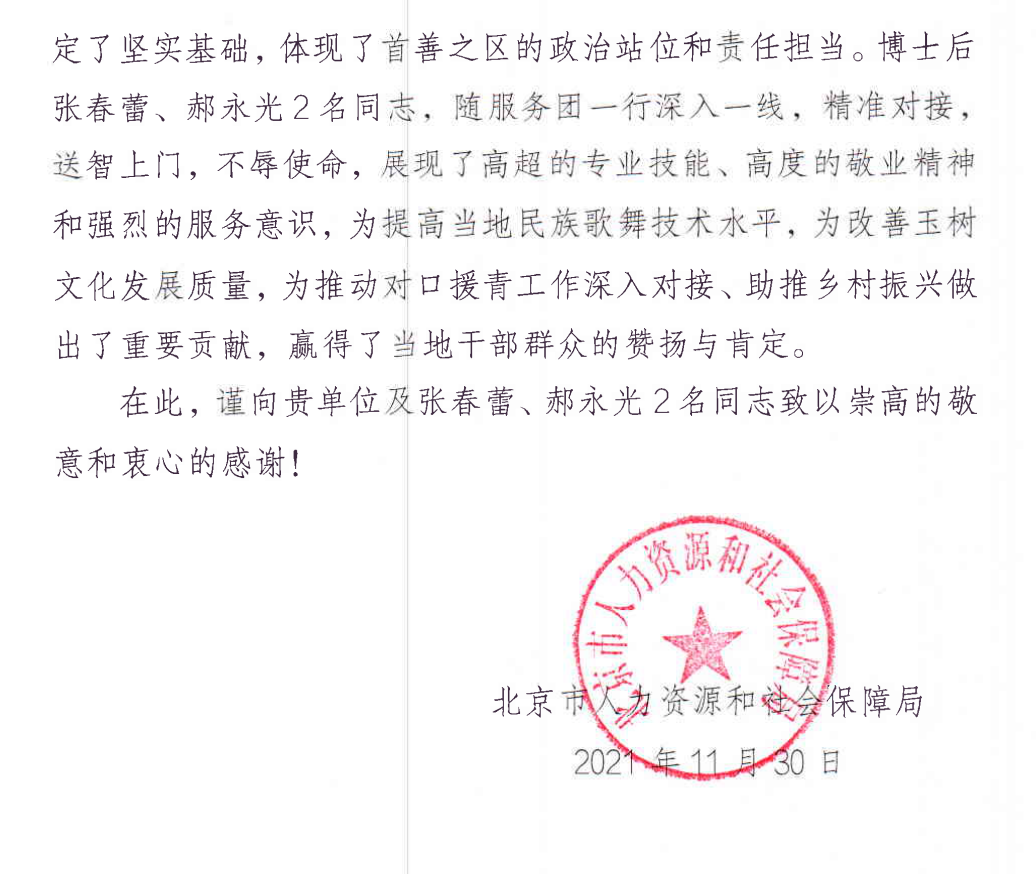 近日,我校收到北京市人社局发来的感谢信,感谢我校大力支持配合完成“2021年北京博士后乡村振兴服务团青海玉树行活动”,以及张春蕾、郝永光两位博士后在活动中的优异表现。两位博士后皆为“中国乐派研究”课题组招收的研究人员。此封感谢信也是对我校近年来大力引进优秀博士后工作的肯定。