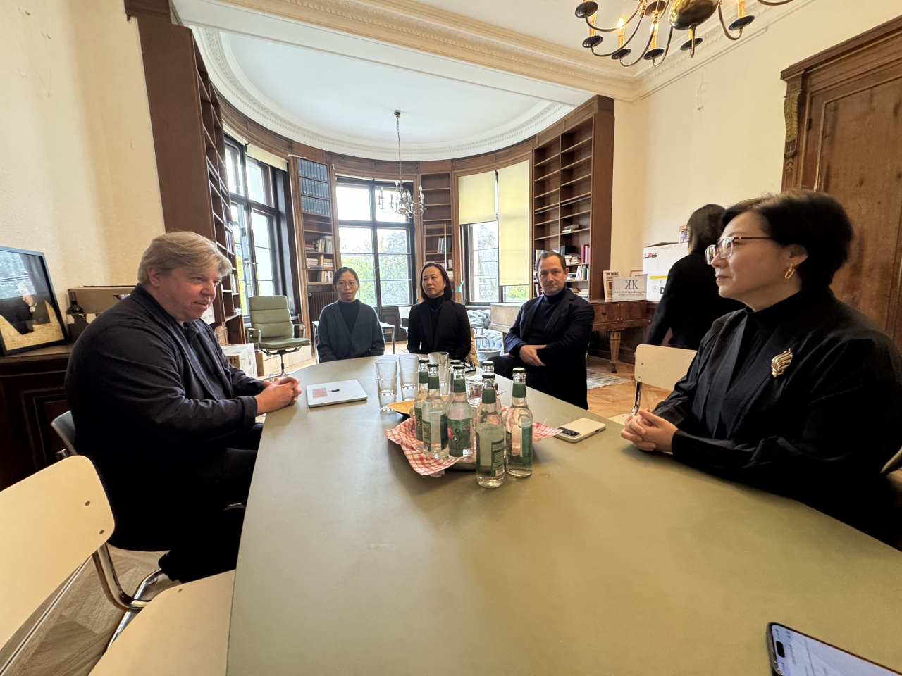 作曲系教师团队到达后即与德国汉堡音乐与戏剧学院院长杨·菲利普·斯普里克、作曲系主任戈登·坎佩和教师代表进行了亲切会谈。双方围绕两校作曲系培养模式、课程体系建设等议题展开了深入交流。会后,作曲系主任高缨向汉堡音乐与戏剧学院院长和作曲系主任分别赠送了《罗忠镕管弦乐作品集》以及出版于建校60周年之际的《乐颂六秩——星空电子作曲系教师作品集 》,并表达了持续推进两校师生互动与合作的意愿。杨·菲利普·斯普里克院长表达了诚挚的谢意,并期待以学科交流为纽带,助力两校伙伴关系迈上新的高度。